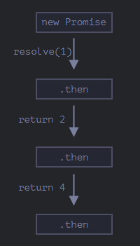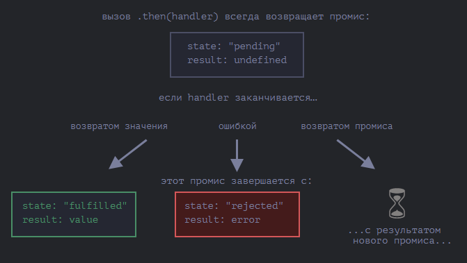 Всё это работает, потому что вызов promise.then тоже возвращает промис, так что мы можем вызвать на нём следующий .then.