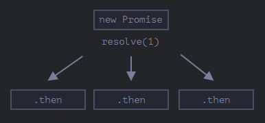 Все обработчики .then на одном и том же промисе получают одно и то же значение – результат выполнения того же самого промиса. Таким образом, в коде выше все alert показывают одно и то же: 1.