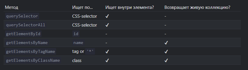 elem.getElementsByTagName(tag)ищет элементы с данным тегом и возвращает их коллекцию. Передав"*"вместо тега, можно получить всех потомков.elem.getElementsByClassName(className)возвращает элементы, которые имеют данный CSS-класс.document.getElementsByName(name)возвращает элементы с заданным атрибутомname. Очень редко используется.